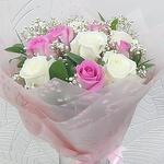 White rose - 5 pcs Gypsophila - 2 pcs ruscus leaves - 3 pcs mix roses - 1 pcs pink roses - 5 pcs