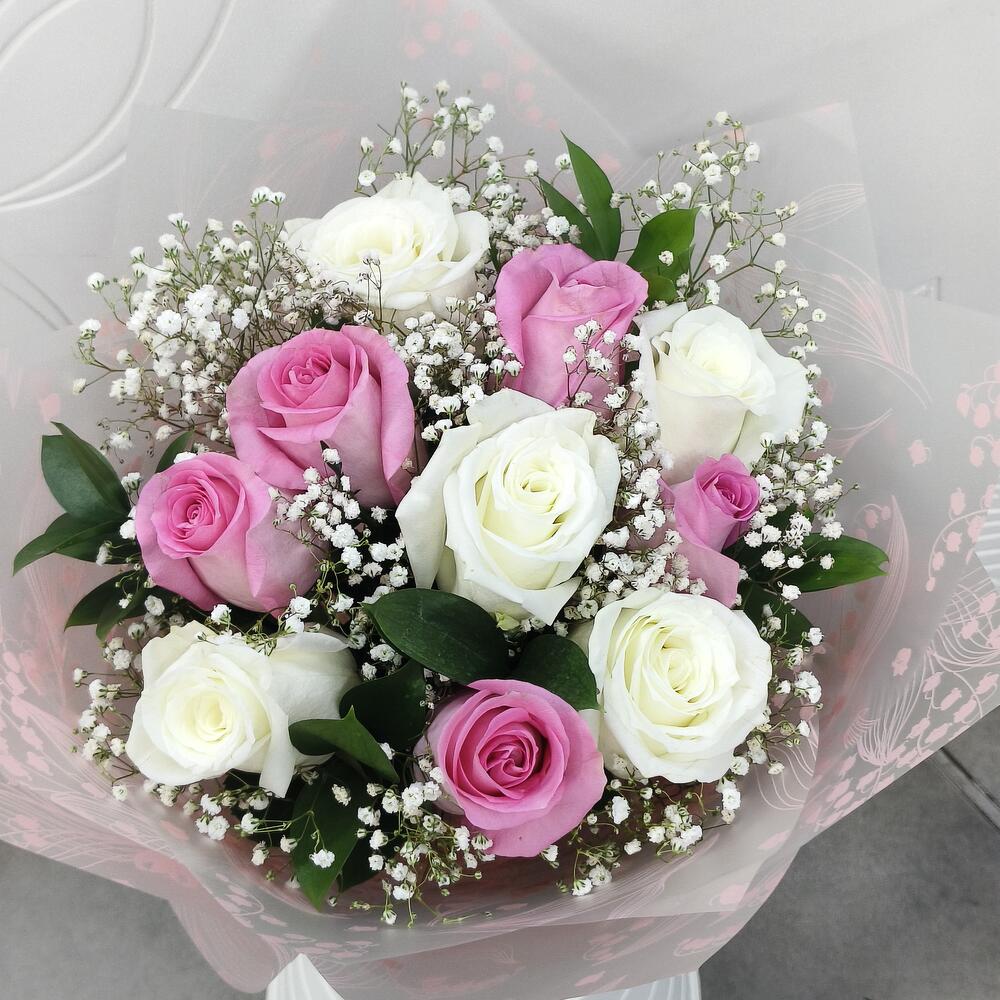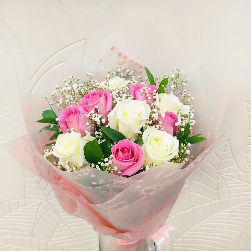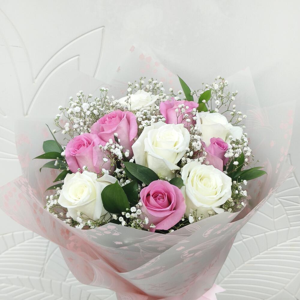 White rose - 5 pcs Gypsophila - 2 pcs ruscus leaves - 3 pcs mix roses - 1 pcs pink roses - 5 pcs