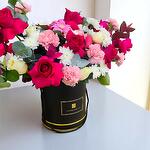Ruscus - 10 pcs black box - 1 pcs carneshan pink - 8 pcs dark pink ros - 8 pcs white ros - 5 pcs creshanthimum white - 4 pcs ecalapthas - 4 pcs
