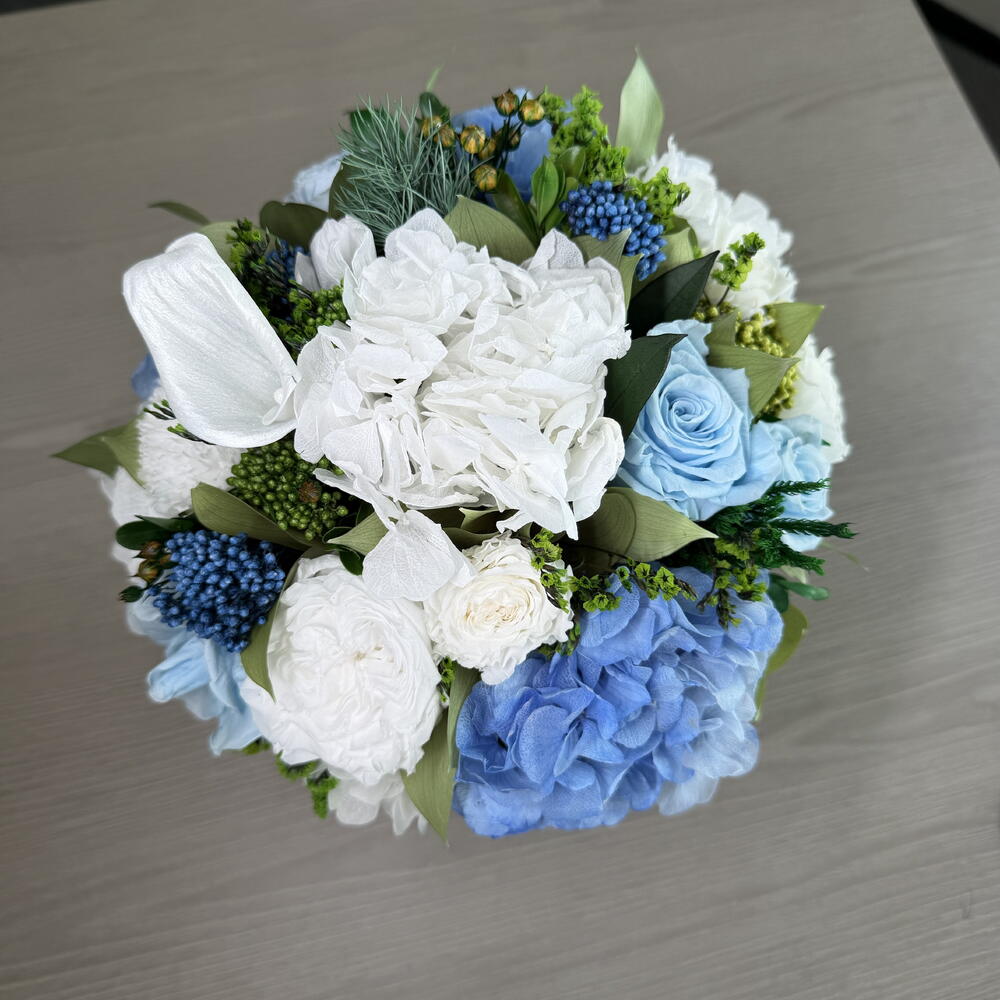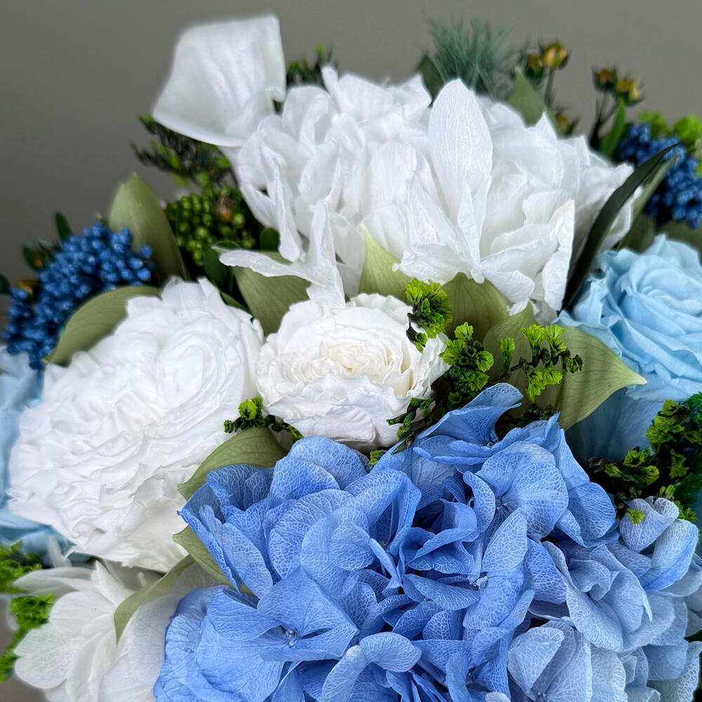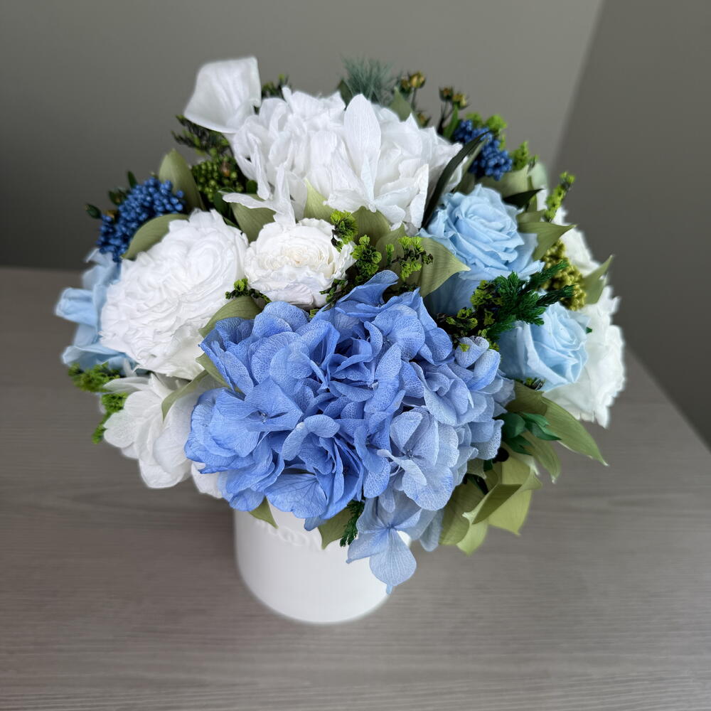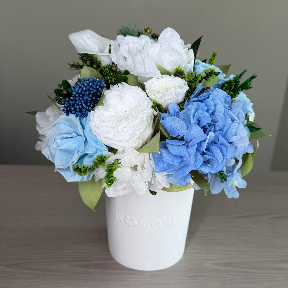 ✨ Premium real flowers that last a year ✨ Luna is a poetic expression of natural beauty, evoking the softness of a gentle breeze through a blooming garden. This exquisite arrangement features bio-preserved white Classic Garden roses, Hydrangeas and greens. Set in a modern white ceramic vase, Luna brings an effortless sense of movement and grace to any space. Designed to last for over a year, this preserved floral arrangement is perfect for luxury interiors, refined gifting, and timeless home décor. This piece is crafted exclusively from 100% natural flowers that have been bio-preserved to last up to one year without the need for water or maintenance. Each arrangement is uniquely designed with love by our in-house florists 🌺