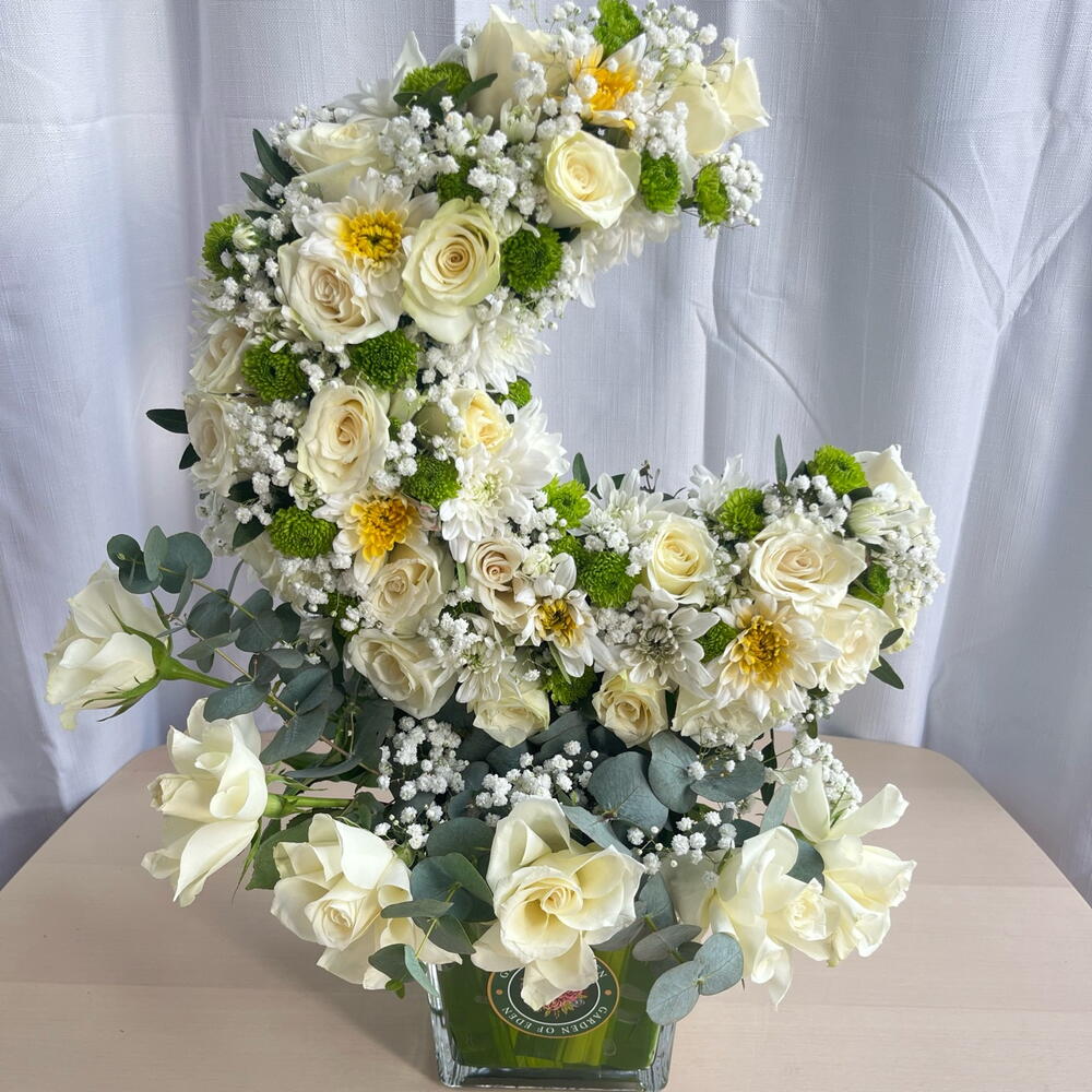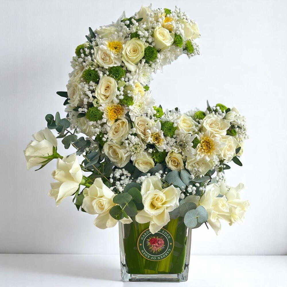 Lunar Bloom Vase – Crescent Moon Arrangement with Roses Chrysanthemums for Ramadan