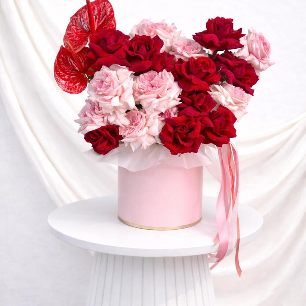 anthurium red - 2 pcs premium red rose - 11 pcs rose ohara pink - 10 pcs blad pistachio - 2 pcs