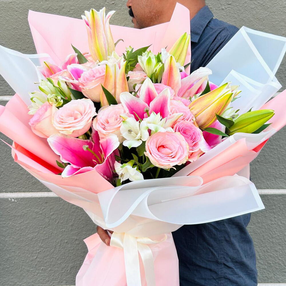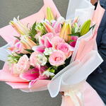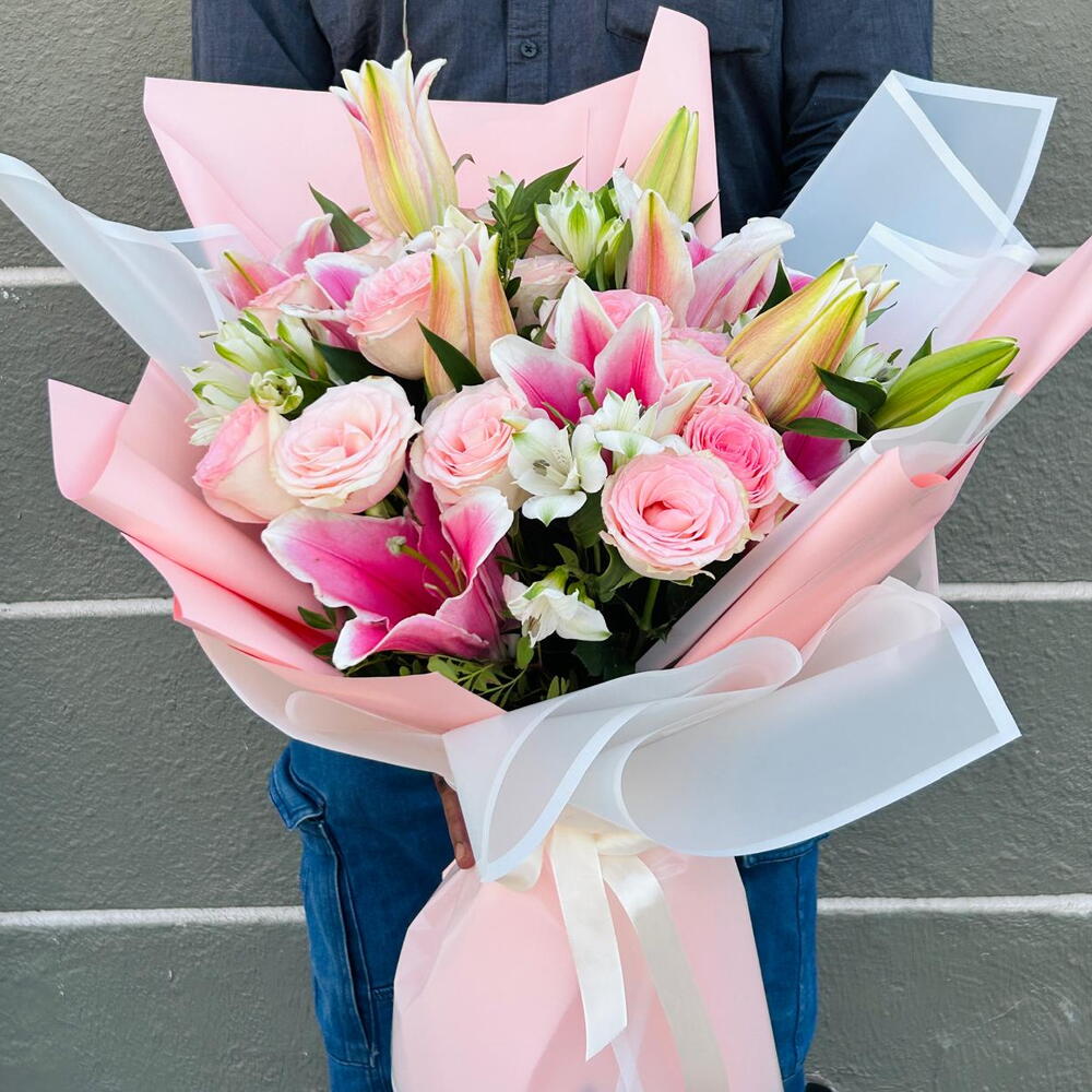 alstroemeria white - 4 pcs rose pink - 7 pcs wrapping paper - 6 pcs lily pink - 4 pcs