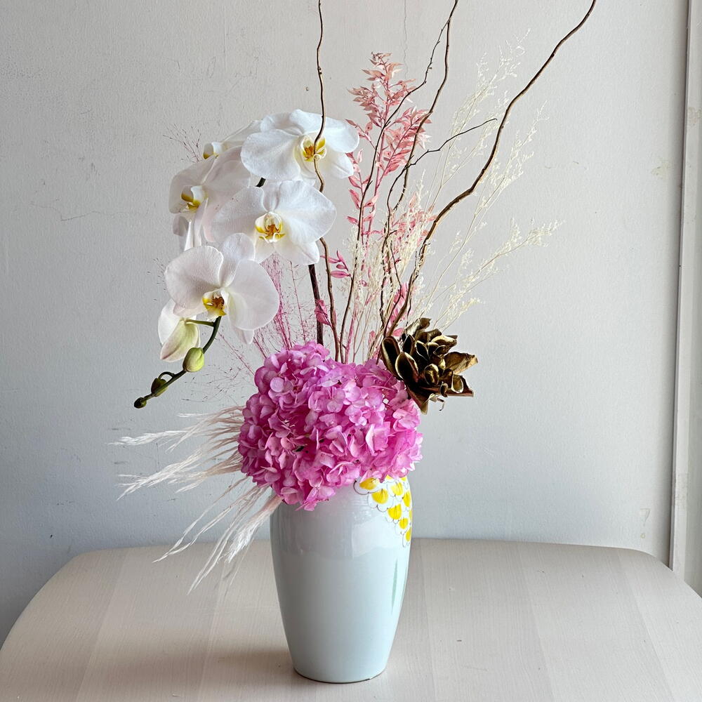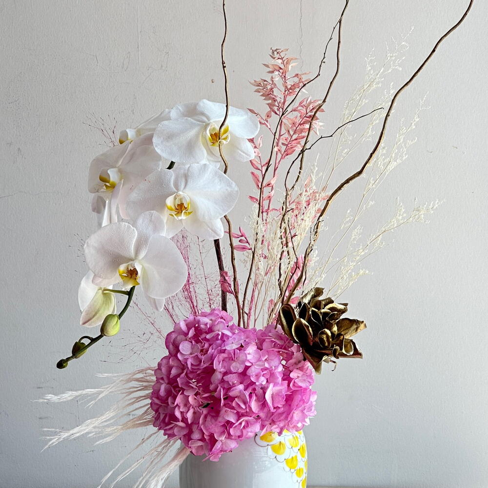 A luxurious pot arrangement of single white phalae ops is plant, pink hydrangea, golden sprayed rose and Salic sticks with fillers