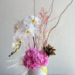 Ceramic pot - 1 pcs hydrangea pink - 1 pcs phalaenopsis orchid - 1 pcs salix sticks - 4 pcs golden sprayed roses - 1 pcs exotic fillers - 5 pcs