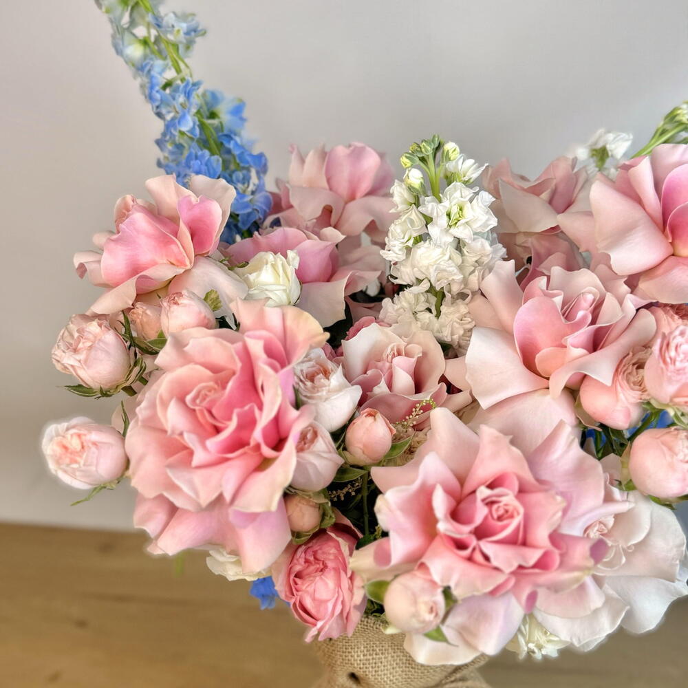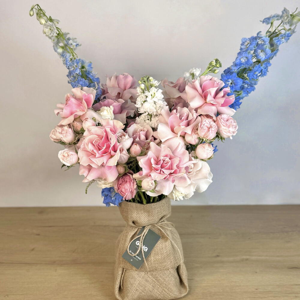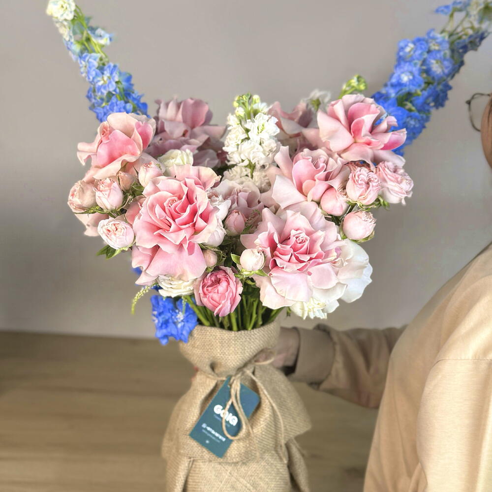 White rose - 3 pcs juliet rose - 2 pcs mondial rose - 5 pcs delphinium blue - 2 pcs matthiola white - 3 pcs bombastic white - 2 pcs