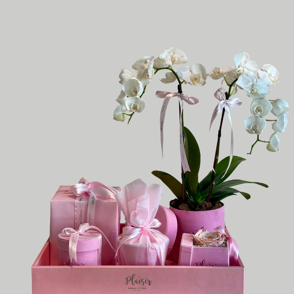 The exquisite Pink Luxury Giftset Tray consists of a fresh mini orchid, our stunning Freesia fragrance, a single infinity rose, a delicious chocolate box, and a Plaisir handmade candle. This impressive tray is sure to wow your receiver with its grandeur! What a wonderful way to wish them well for any occasion, be it for a gentleman or for a lady!