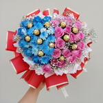 Ferrero rocher - 12 pcs baby's breath - 3 pcs blue chrysanthemum - 2 pcs pink roses - 17 pcs blue roses - 8 pcs