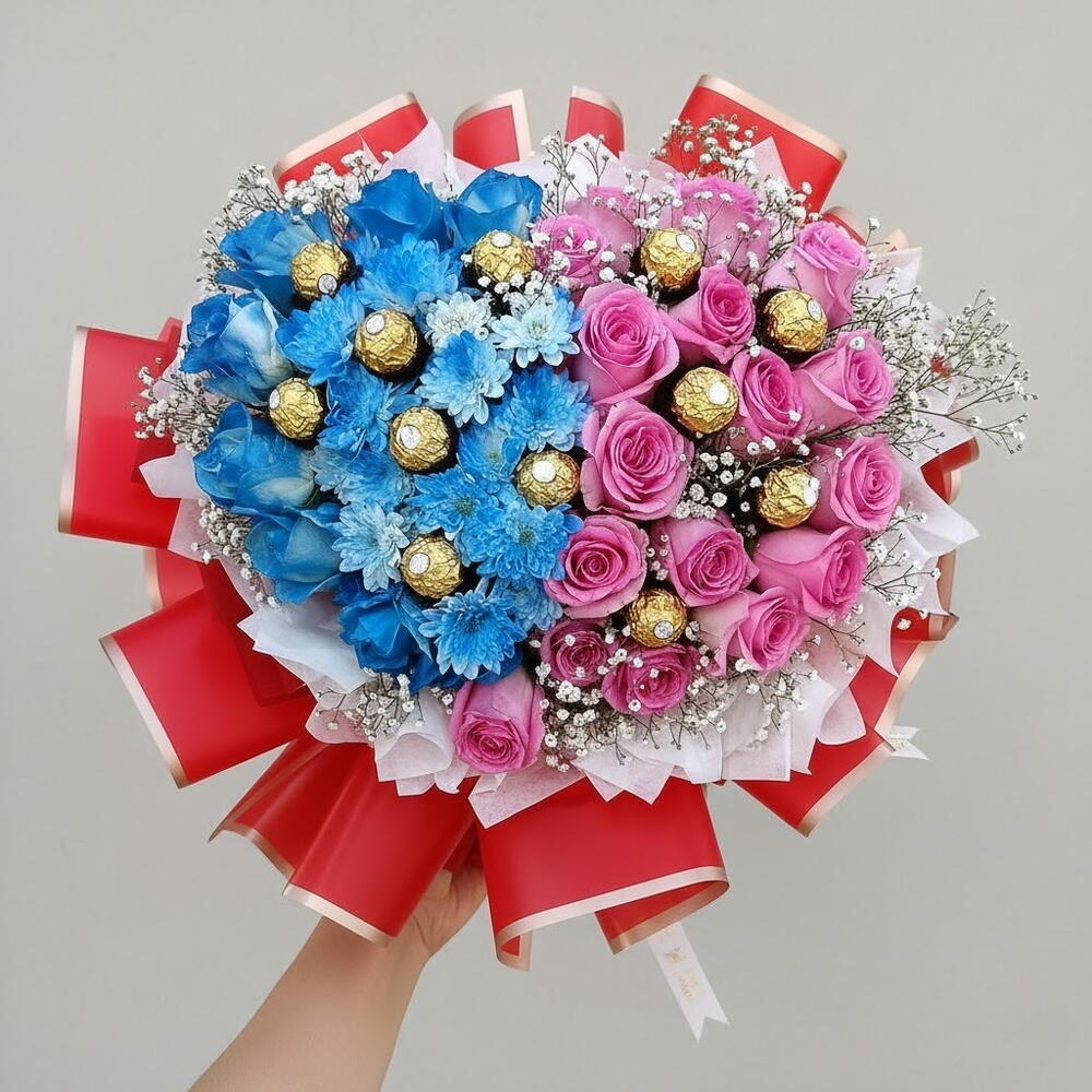 This vibrant and luxurious bouquet features a beautiful combination of pink and blue roses, complemented by bright blue chrysanthemums and delicate baby’s breath. The addition of golden-wrapped Ferrero Rocher chocolates brings a sweet and indulgent touch to this already stunning arrangement. The bouquet is wrapped in elegant red and white tissue paper, with a festive ribbon tying it all together. This eye-catching design makes it a perfect gift for special occasions such as birthdays, anniversaries, or any celebration of love. For care, change the water regularly and trim the stems by about 1 cm every few days to keep the bouquet fresh. Keep it away from direct sunlight and in a cool place to maintain the flowers’ vibrancy.