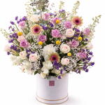 Immerse yourself in the enchanting harmony of 30 luxurious mixed roses, combined with 3 pristine carnations, 5 sprigs of delicate Gypsophila, 5 stems of radiant Delphinium and 10 sprigs of graceful Limonium. Carefully arranged in a lovely box, this opulent assortment is perfect for expressing deep feelings and creating timeless moments. Transport your senses to a floral paradise and celebrate any occasion with this breathtaking display of natures beauty!