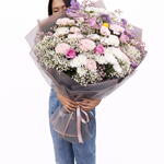elegant mixed flower bouquet featuring soft pink roses, white chrysanthemums, carnations, purple fillers, and delicate baby’s breath, beautifully wrapped in premium packaging. Perfect for birthdays, anniversaries, congratulations, and special surprises. Fresh flower delivery available across UAE.