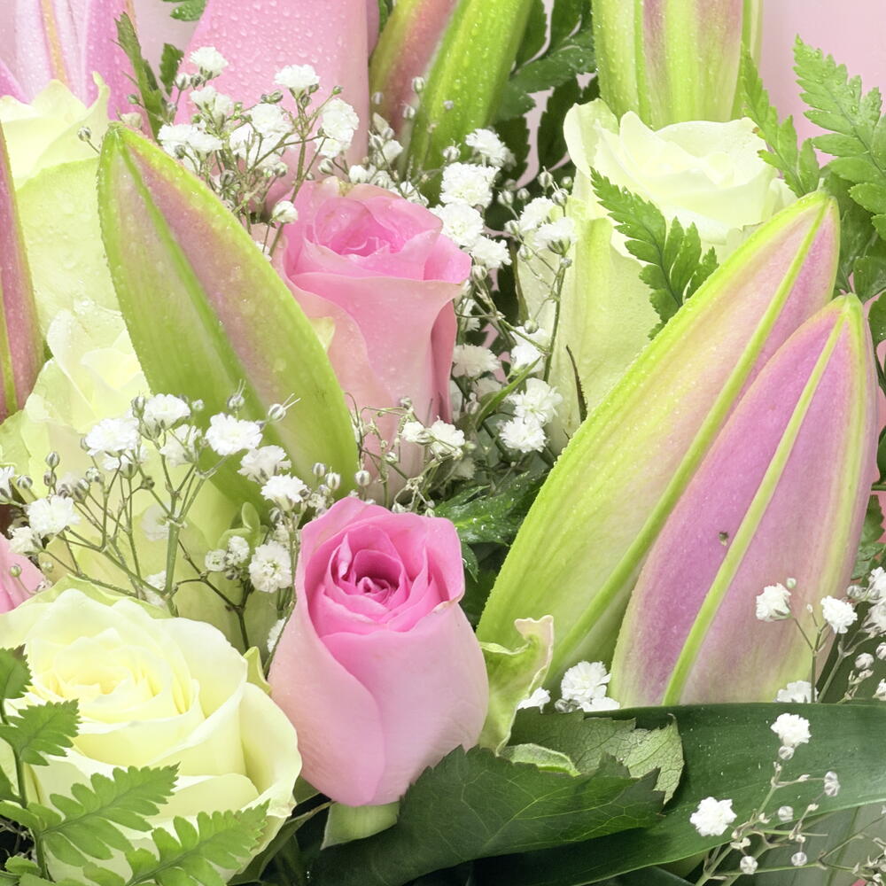 pink lilies - 5 pcs leather fern - 4 pcs pink roses - 5 pcs white roses - 5 pcs