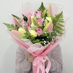 Bouquet of 5 pink lilies, 5 white rose and 5 pink rose with fillers in a nice pink wrapping.
