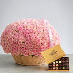 A full round basket arrangement of 601 pink roses and 24 Premium Godiva Assorted Chocolates beautifully crafted in an elegant gift box
