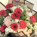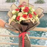 Red Gerbera - 8 pcs gypsophilia - 3 pcs white lisianthus - 3 pcs peach spray roses - 6 pcs ruscus green - 2 pcs