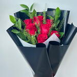 A stunning bouquet of 7 fresh red roses with lush greenery, elegantly wrapped in stylish black paper. Perfect for romantic gifts, anniversaries, birthdays, or special surprises