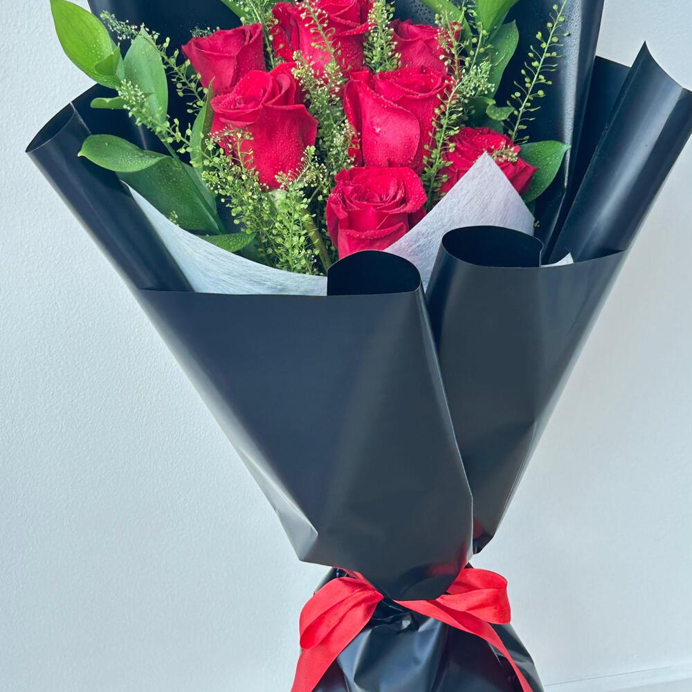 A stunning bouquet of 7 fresh red roses with lush greenery, elegantly wrapped in stylish black paper. Perfect for romantic gifts, anniversaries, birthdays, or special surprises