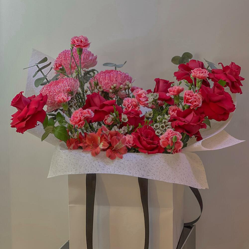 Red rose - 10 pcs Eucalyptus - 6 pcs Wax flower - 4 pcs spray carnation - 5 pcs ping pong - 3 pcs alstoemeria - 3 pcs