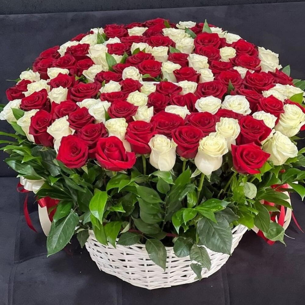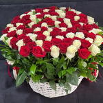 Basket - 1 pcs Leaves - 12 pcs red roses - 54 pcs white roses - 48 pcs