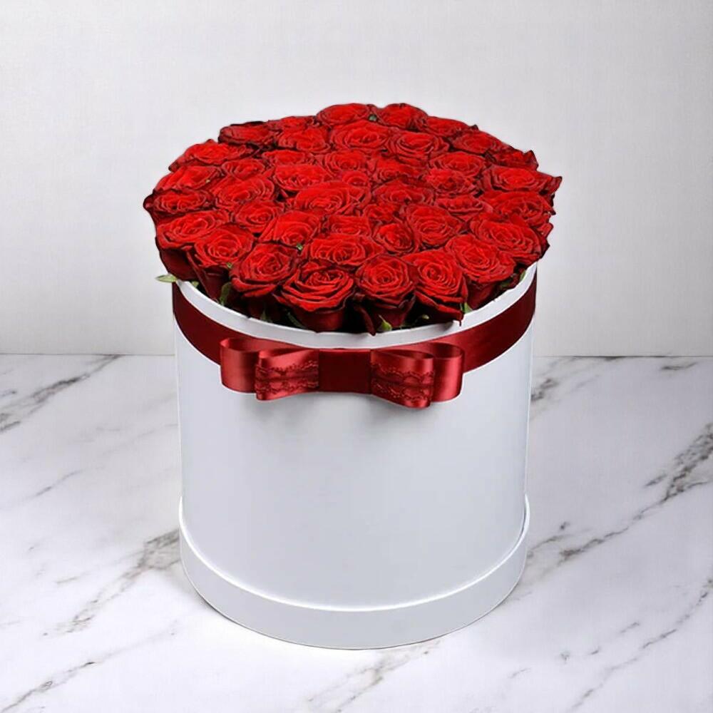 Luxury White Box of 35 Red Roses | Elegant Round Gift Box Arrangement
