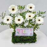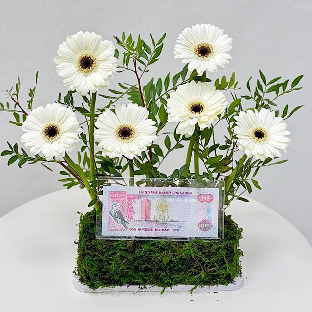 Uncover the charm of our Florists Special collection with this mesmerizing assortment. This item consists of 2 pieces of vigorous green leaves and 5 pieces of captivating pistachio leaves artistically arranged. Its aesthetic appeal is further enhanced by a unique money box - a piece to keep your precious memories. The arrangement is finished off with 6 pieces of pristine white garbera, giving it an enchanting allure. This elegant and refined piece is perfect to add a touch of extravagance and natural beauty to any setting.