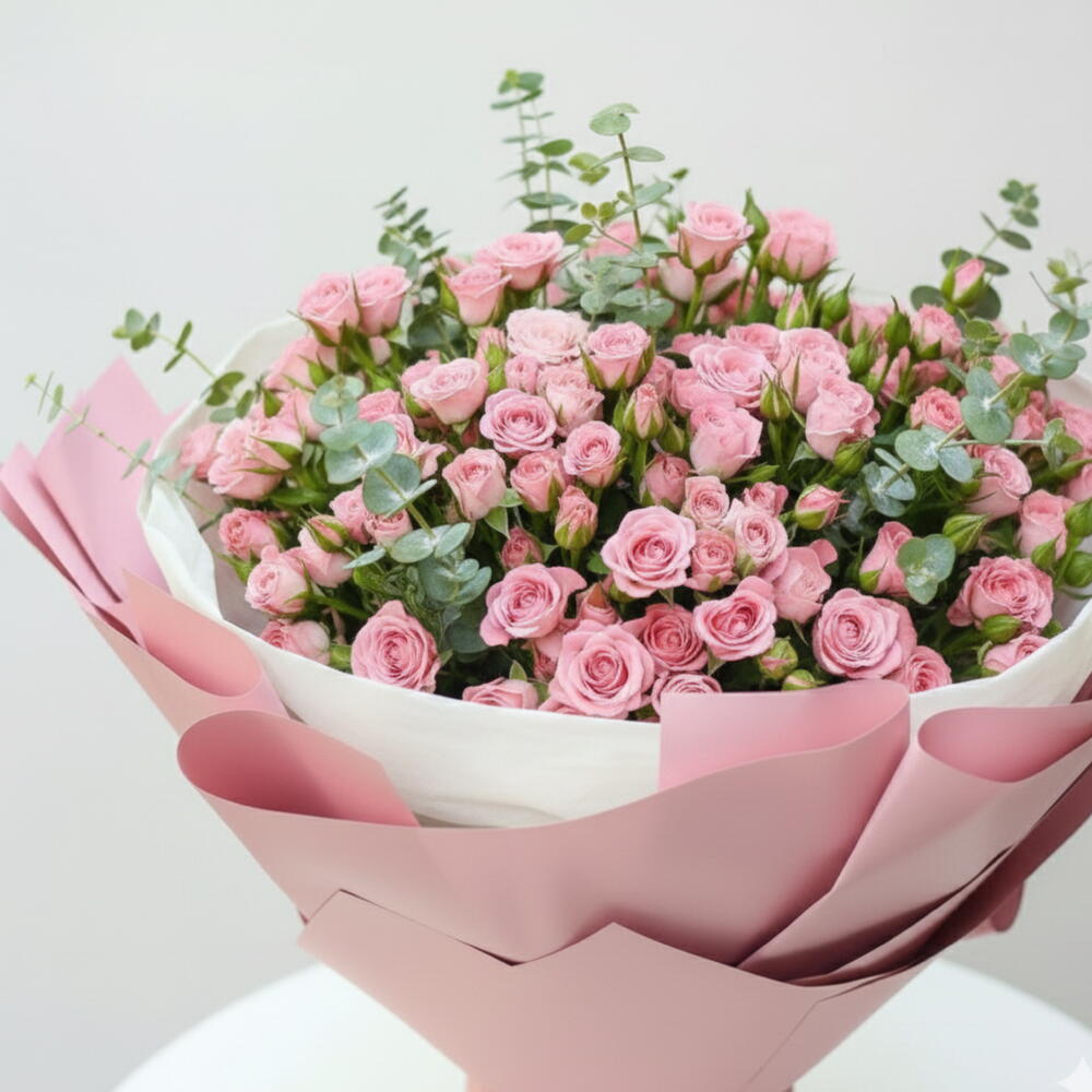 Make a bold, unforgettable impression with the Statement Premier Pink Spray Rose 101 Eucalyptus in Pink Wrap, a luxurious floral masterpiece designed to captivate hearts and elevate every occasion. This grand bouquet features 101 premium pink spray roses, celebrated for their multiple delicate blooms per stem, creating an exceptionally full, rich, and textured arrangement that stands out instantly. Soft blush and pastel pink tones flow harmoniously through the bouquet, symbolizing love, admiration, gratitude, joy, and elegance. The addition of fresh eucalyptus foliage brings a modern, airy contrast with natural greenery and a subtle refreshing fragrance, enhancing both the visual appeal and sensory experience. Wrapped in a premium pink wrap, this statement bouquet exudes refined luxury and contemporary style. The elegant presentation makes it ideal for those who want to express emotions on a grand scale—whether romantic, celebratory, or heartfelt. Perfect for anniversaries, proposals, weddings, Valentine’s Day, birthdays, baby celebrations, congratulations, corporate gifting, luxury events, and premium home décor, this bouquet is designed to reach every emotion and suit every audience. Its abundant blooms ensure long-lasting beauty and a truly Instagram-worthy presence. Florist-crafted with attention to detail and freshness, the 101 Pink Spray Rose Eucalyptus Bouquet is more than flowers—it’s a statement of love, appreciation, and timeless elegance.