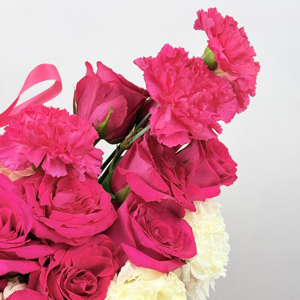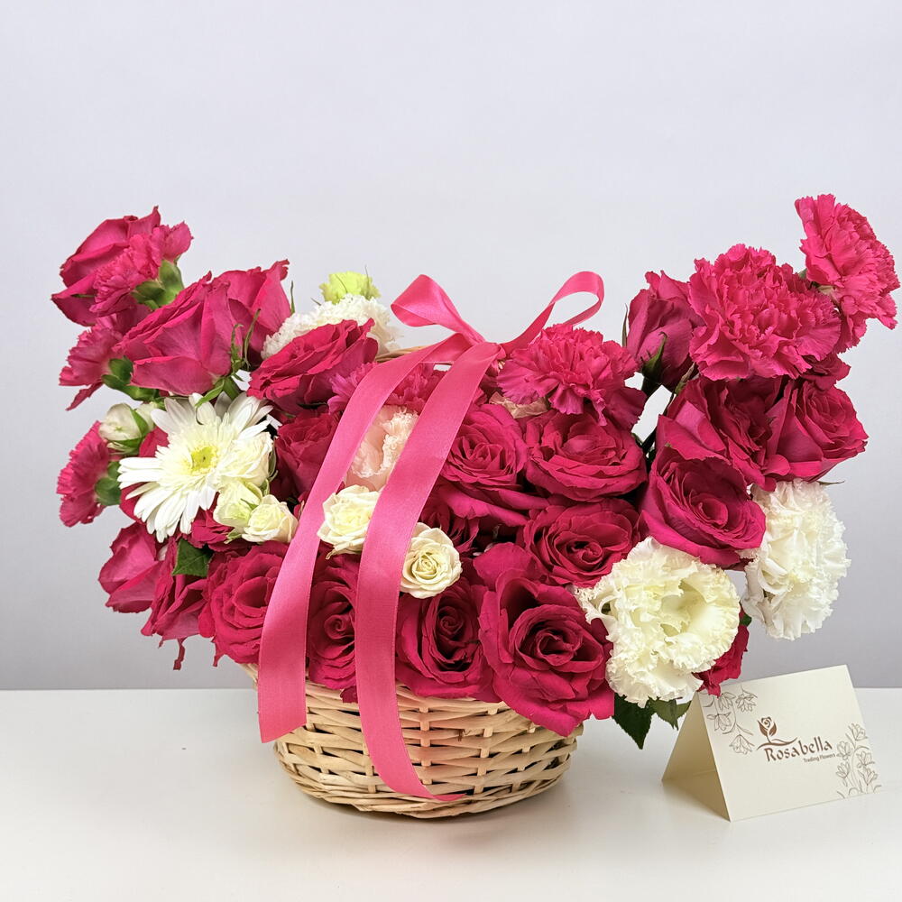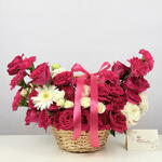 Basket - 1 pcs Eustoma white - 3 pcs spray rose white - 3 pcs gerbera white - 1 pcs rose cerise - 25 pcs carnation cerise - 7 pcs