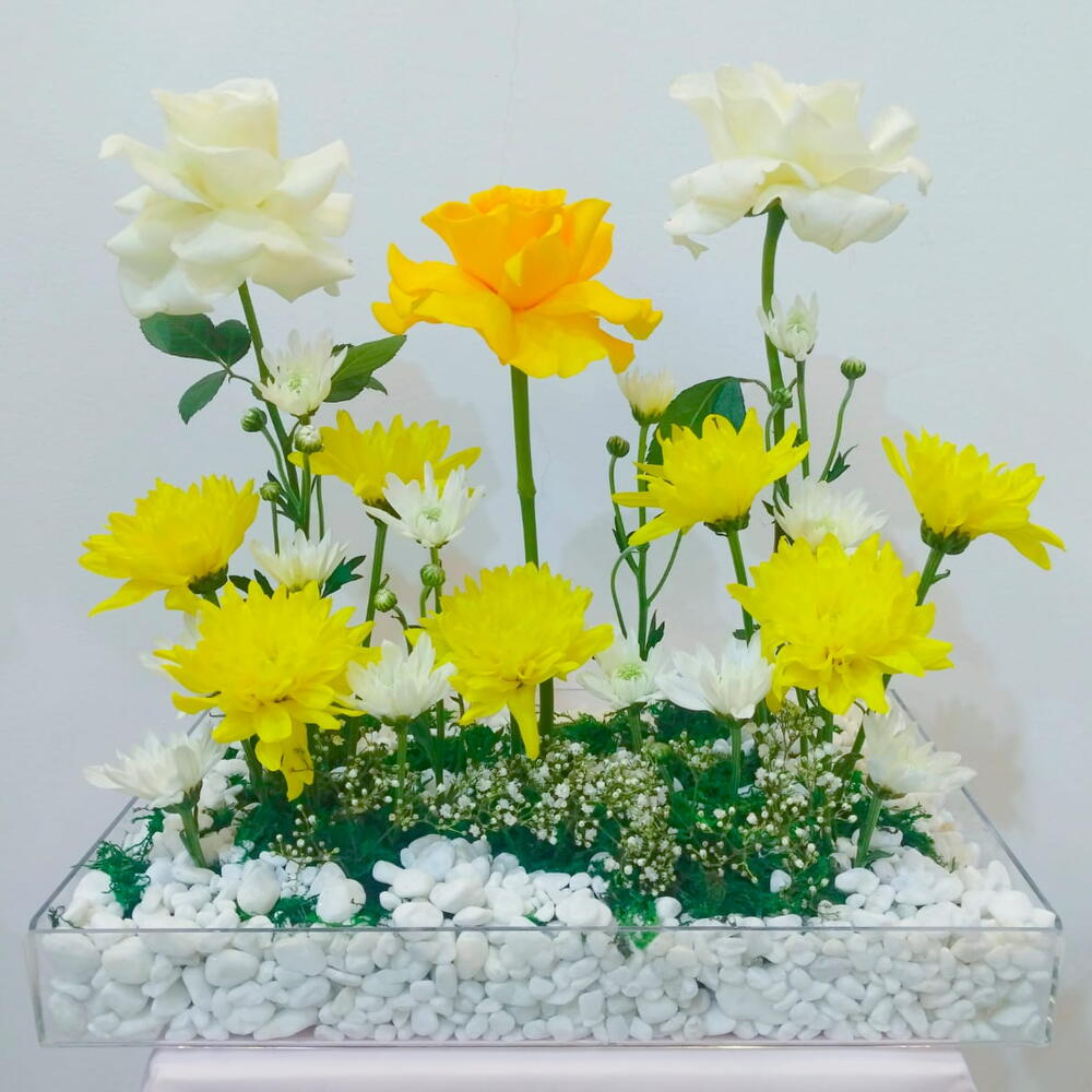 Chrysanthemum - 9 pcs White rose - 2 pcs Gypsophila - 5 pcs Yellow rose - 1 pcs yellow chrysanthemum - 7 pcs
