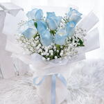 Unveil your love and admiration with this charming Mono Bouquet. Its brimming with 10 ethereal light blue roses, tastefully sprayed to contrast their natural beauty. To add an artistic touch, the bouquet incorporates 3 pieces of gyso, contributing to its unique texture and character. This exquisite bouquet is a perfect choice for those desiring to share a piece of their heart in an unconventional yet elegant manner.