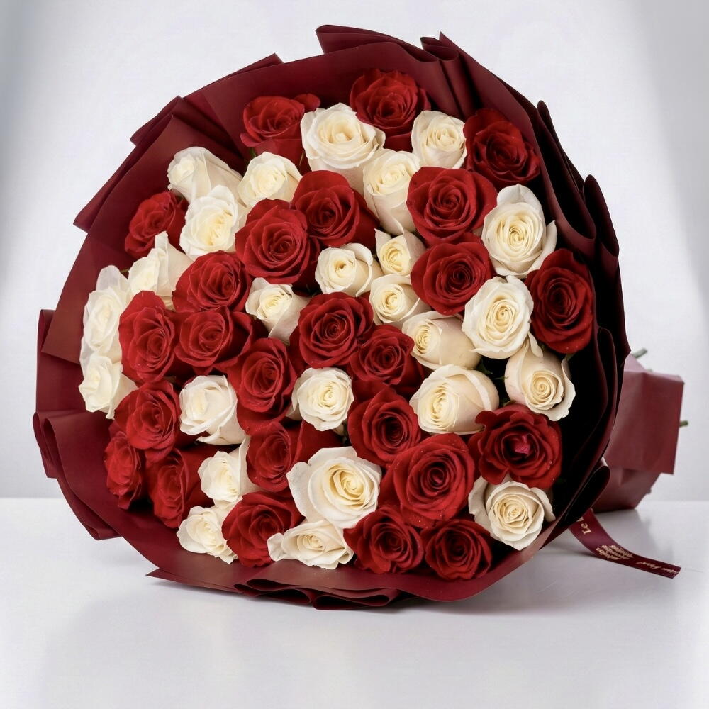 A grand bouquet of 51 premium red and white roses crafted for powerful romantic expressions.