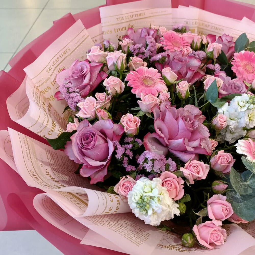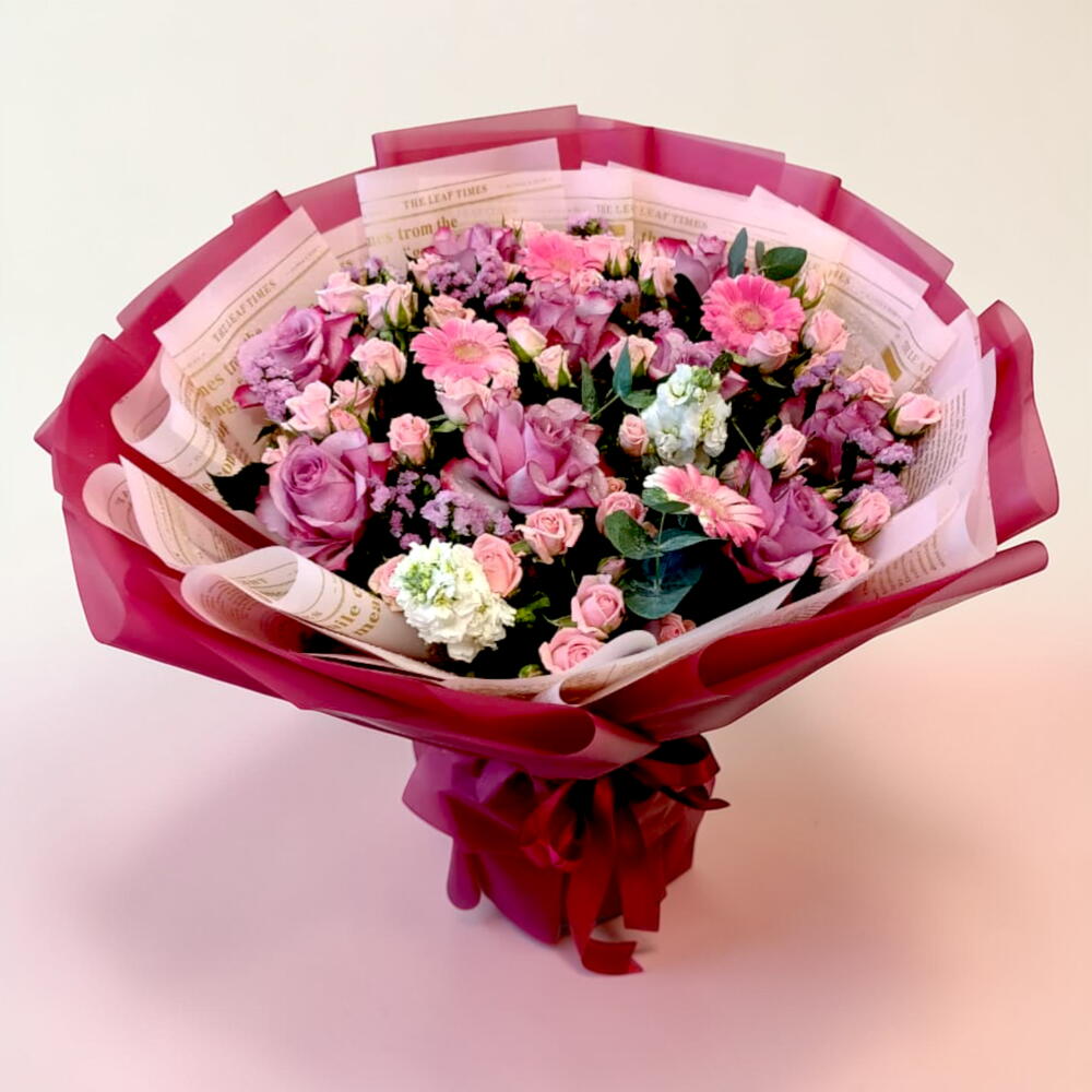 This richly layered artisan bouquet features a sophisticated palette of deep lavender roses, vibrant pink gerbera daisies, and delicate blush spray roses. Accented with white stock flowers and purple filler for a full, garden-fresh texture, the arrangement is uniquely encased in vintage-style newsprint and deep plum sculptural wrap, creating a bold and artistic statement.