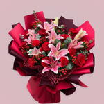 3 stem pink lilly, 5 stem red rose, 6 stem red carnation, 5 stem eucalyptus