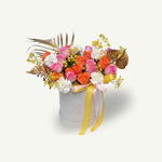 A vibrant mixture of 25 to 30 pink and orange roses, 10 white carnations, yellow gypsophila, gold anthurium, gold fern, and areca leaves gently crafted in a white velvet box for a radiant and elegant touch.