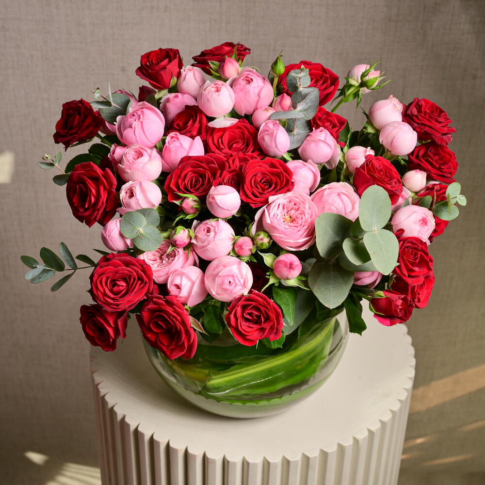 Ribbon - 1 pcs glass bowl - 1 pcs mansfield park pink roses - 10 pcs eucalyptus sprigs - 4 pcs trendsetter red roses - 5 pcs