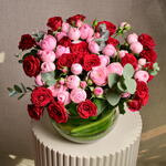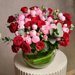 The Mansfield Park Trendsetter Red Roses Mix Bowl is a perfect fusion of elegance and romance. Featuring 10 Mansfield Park pink roses and 5 Trendsetter red roses, this arrangement is beautifully displayed in a glass bowl with fresh eucalyptus sprigs. Tied with a red ribbon, it offers a vibrant yet sophisticated appeal for any special occasion.One stem of spray roses may have 3 or 4 flowers.