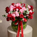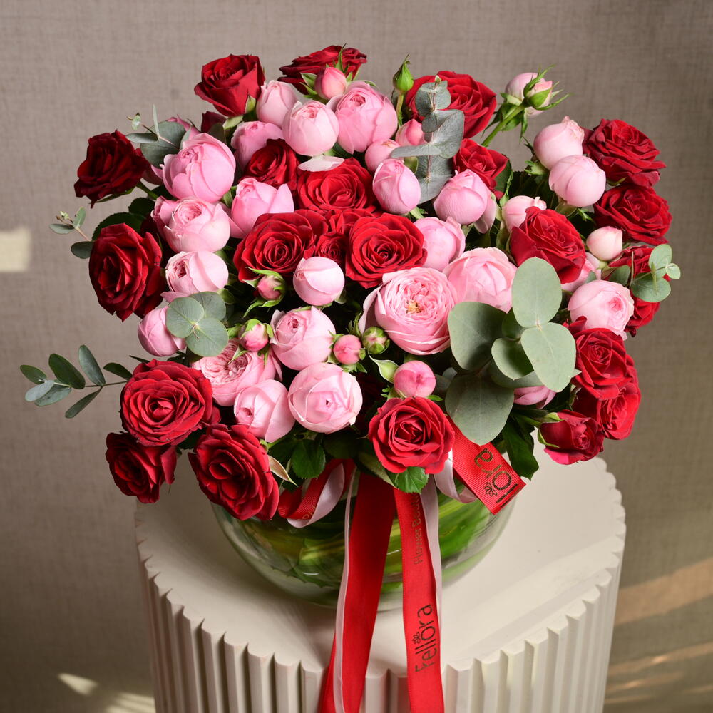Ribbon - 1 pcs glass bowl - 1 pcs mansfield park pink roses - 10 pcs eucalyptus sprigs - 4 pcs trendsetter red roses - 5 pcs