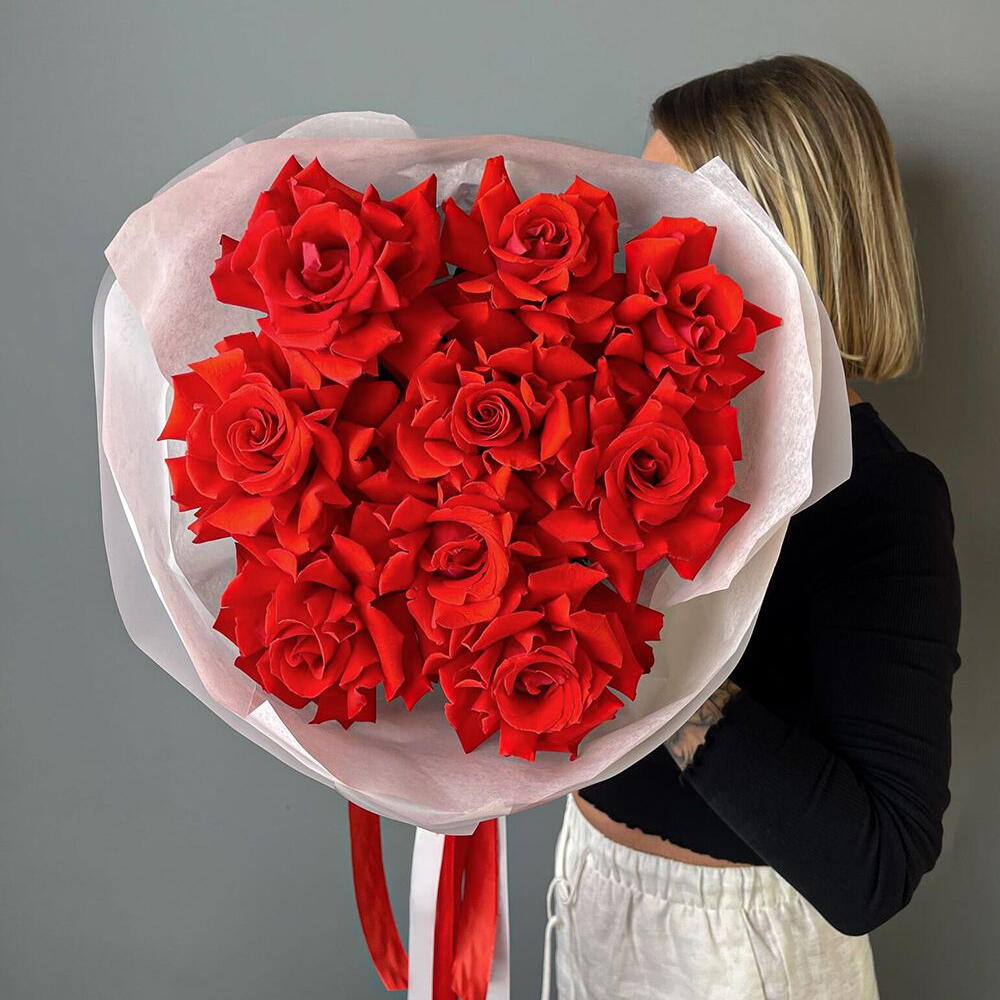 This bouquet is the very essence of classic romance, embodied in nine flawless French roses. Their deep red color speaks of passion and intense emotion, while the noble shape of the buds exudes elegance and impeccable taste. I arranged them in a simple bouquet so that nothing distracts from their majestic beauty. The light white packaging only highlights their fiery hue.