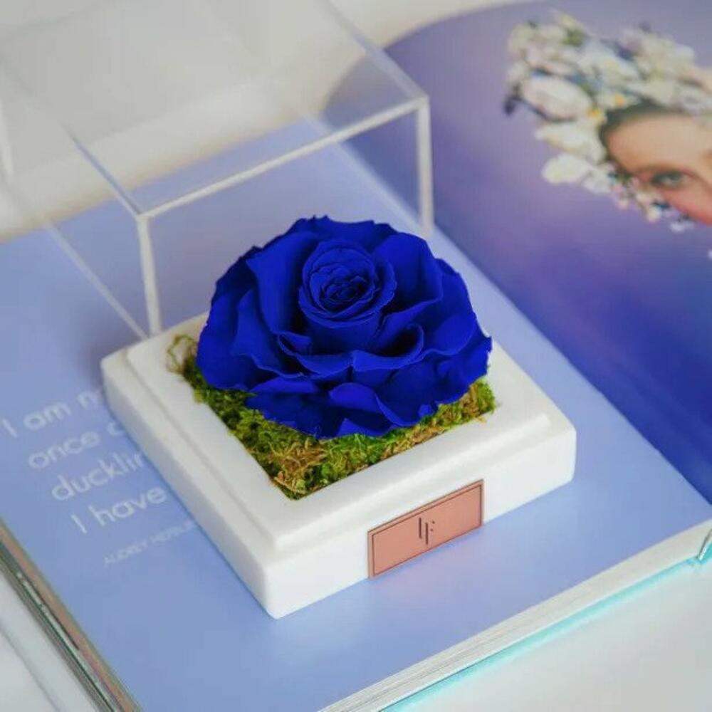 Floral composition of infinity rose in a white marble box.