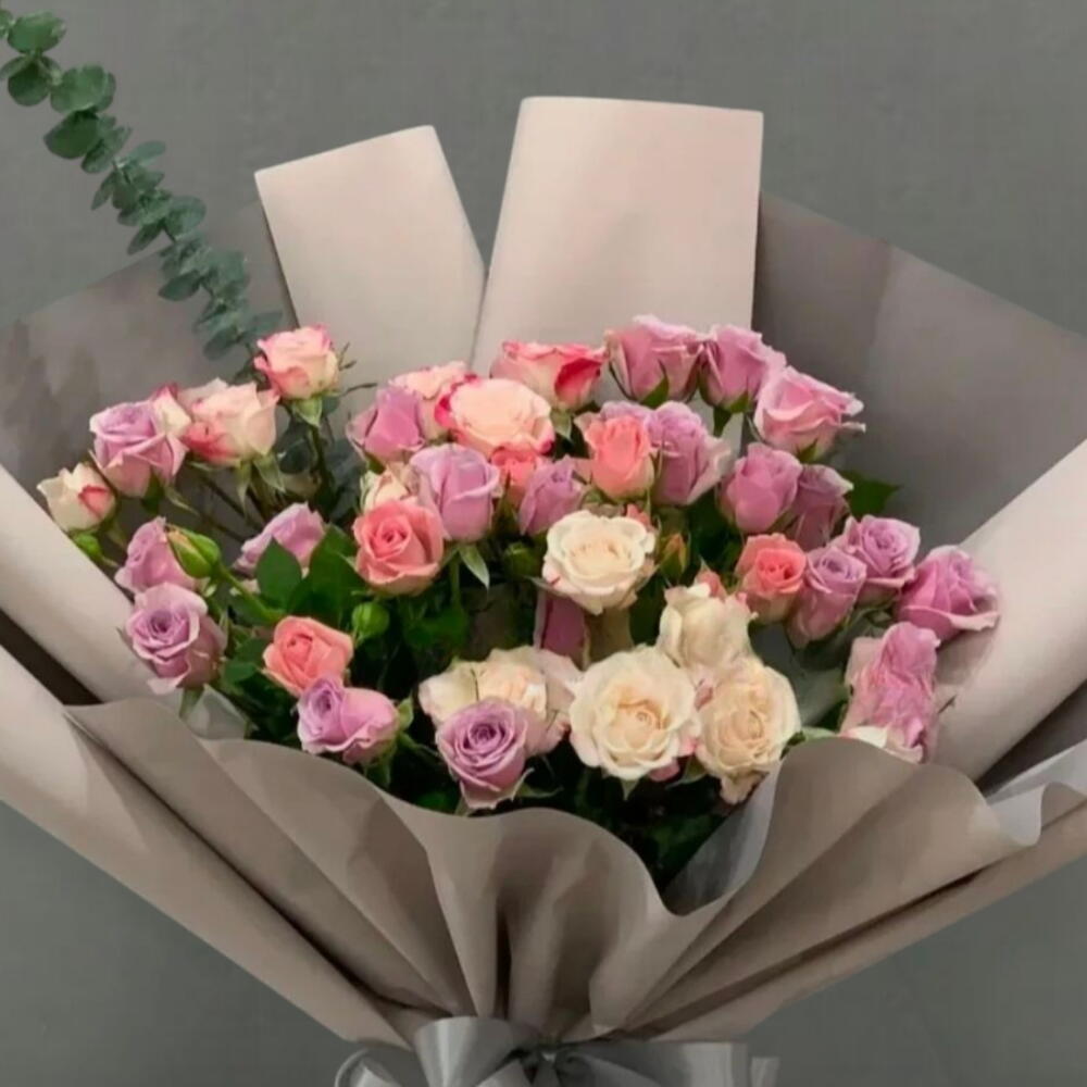 eucalyptus leaves - 1 pcs pink spray roses - 10 pcs white spray roses - 15 pcs purple spray roses - 21 pcs