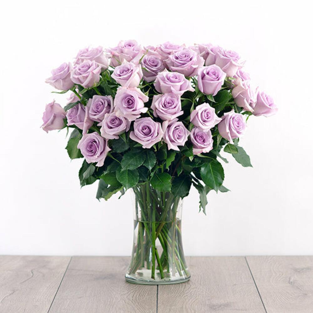 A fantastic Clear glass vase arrangement of 24 Pearly purple roses. Send this vase arrangement today to brings a smile and happiness to your loved one's