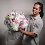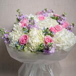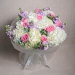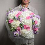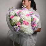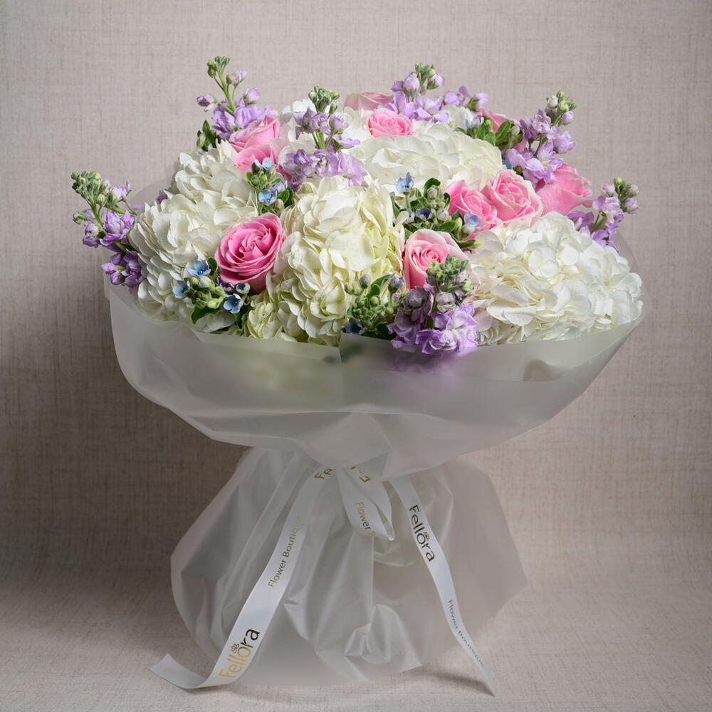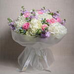 A delicate and elegant bouquet featuring 6 hydrangeas, 9 matthiola, 11 Rosita roses, and 9 oxypetalum, beautifully arranged to create a soft and enchanting floral display, perfect for any occasion.