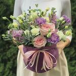 Composition: Spray Rose Snow bubble white - 1, Rose Pink Ohara - 2, Mattiola - 3, Dianthus - 4, Eucalyptus - 2, Lisianthus - 4, velvet bag - 1, ribbon - 2 Sizes: WIDTH - 35CM; HEIGHT - 25CM; LENGTH - 25CM; (including packaging) Size: 35 x 25 x 25 cm