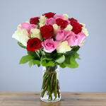 glass vase - 1 pcs red roses - 17 pcs white roses - 17 pcs pink revival roses - 17 pcs
