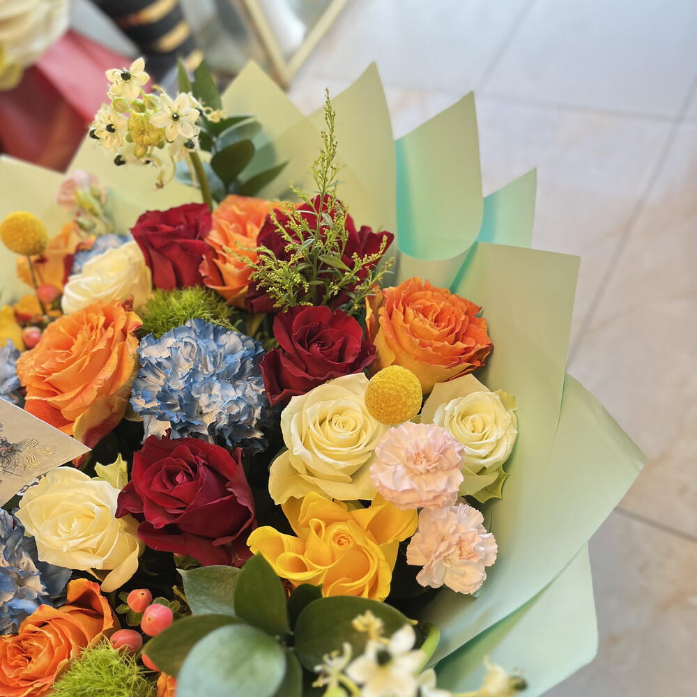 Ornithogalum - 4 pcs wrapping paper - 10 pcs single ruscus - 5 pcs ribbon satin bow - 1 pcs craspedia flowers - 4 pcs mix roses - 30 pcs carnation mix colour - 10 pcs