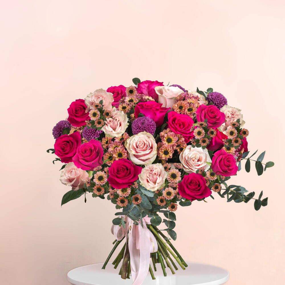 rose - 36 pcs mum - 10 pcs uclyptus - 3 pcs satini - 24 pcs