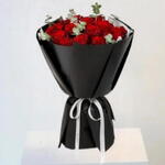 a beautiful red rose bouquet wrapped in black paper.