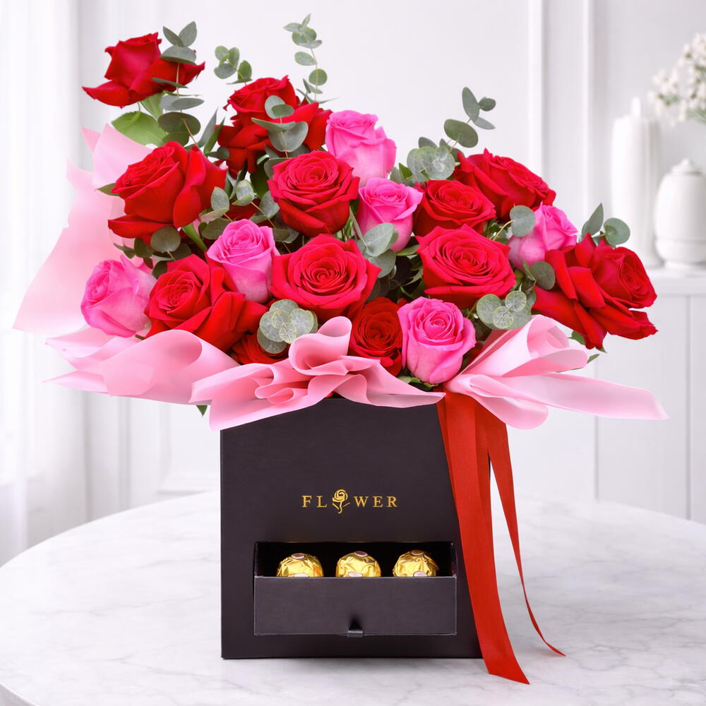 • 21 Red Pink Rose Stems • Leaves – 3 Stems Eucalyptus • Beautifully Arranged in Black Square Box with Pink Tissue • Includes 6 Pcs Ferrero Rocher Chocolates • Tied with Red Ribbon Bow