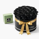 Bold, mysterious, and unapologetically luxurious, the Midnight Noir box features 21 premium black roses arranged in our signature hat box and finished with a refined gold ribbon. Black roses symbolize strength, deep admiration, and unforgettable love — making this a powerful Valentine’s choice for those who prefer something truly different. Paired with indulgent Patchi chocolates, this gift is designed for confident gestures and lasting impressions. Limited Valentine availability. Pre-book early.