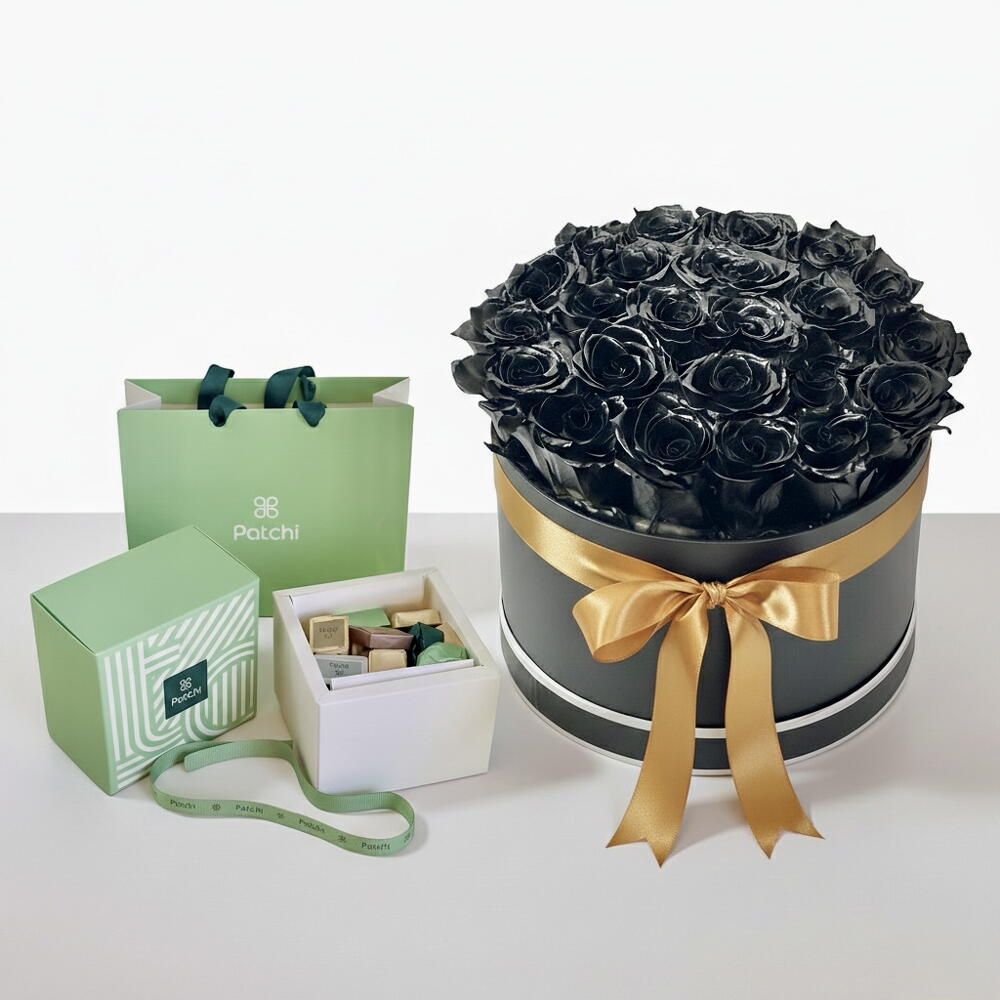 Bold, mysterious, and unapologetically luxurious, the Midnight Noir box features 21 premium black roses arranged in our signature hat box and finished with a refined gold ribbon. Black roses symbolize strength, deep admiration, and unforgettable love — making this a powerful Valentine’s choice for those who prefer something truly different. Paired with indulgent Patchi chocolates, this gift is designed for confident gestures and lasting impressions. Limited Valentine availability. Pre-book early.