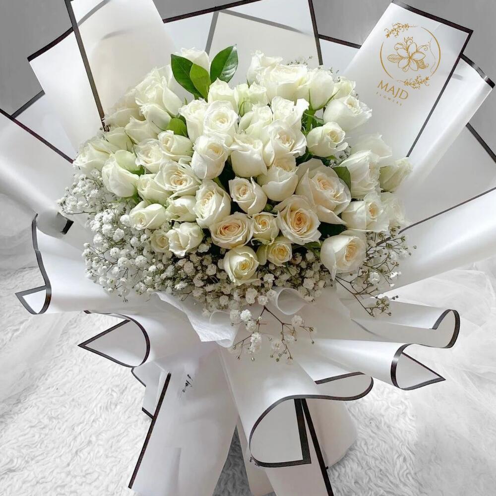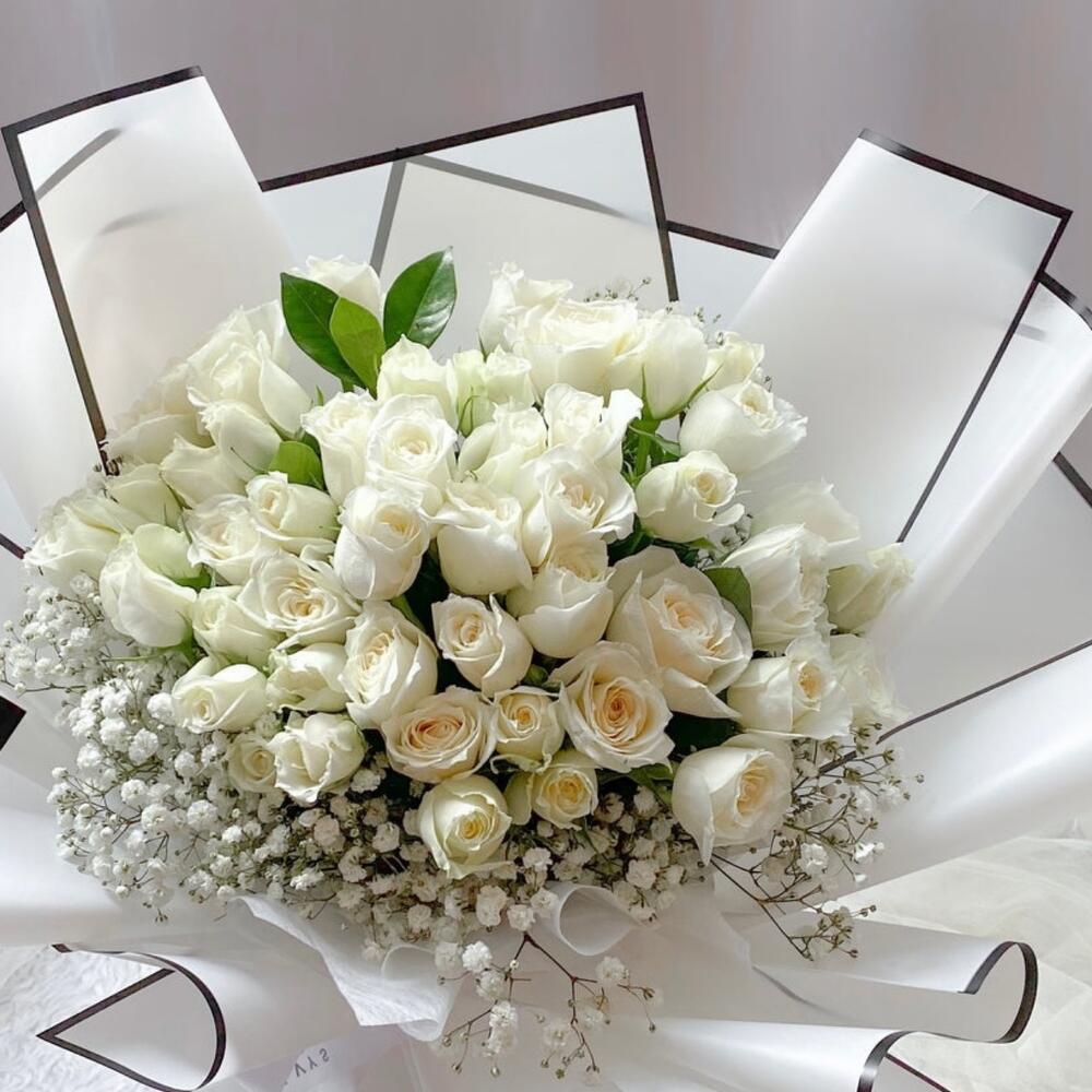 *Elegant and serene, this bouquet of creamy white roses and delicate baby’s breath is a gentle expression of purity, peace, and heartfelt love. Perfect for those tender moments when words aren’t enough.